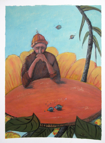 Dans ces illustrations se dévoilent deux mondes qui se répondent : celui de l’air et celui de l’eau. Un oiseau flamboyant, couronne dressée vers le ciel, observe avec noblesse son horizon, tandis qu’au-dessous, les poissons évoluent dans un silence mystérieux, au milieu de fleurs immergées. Ensemble, ils composent un voyage poétique où chaque regard, chaque couleur, raconte la beauté fragile et surprenante de la nature.
